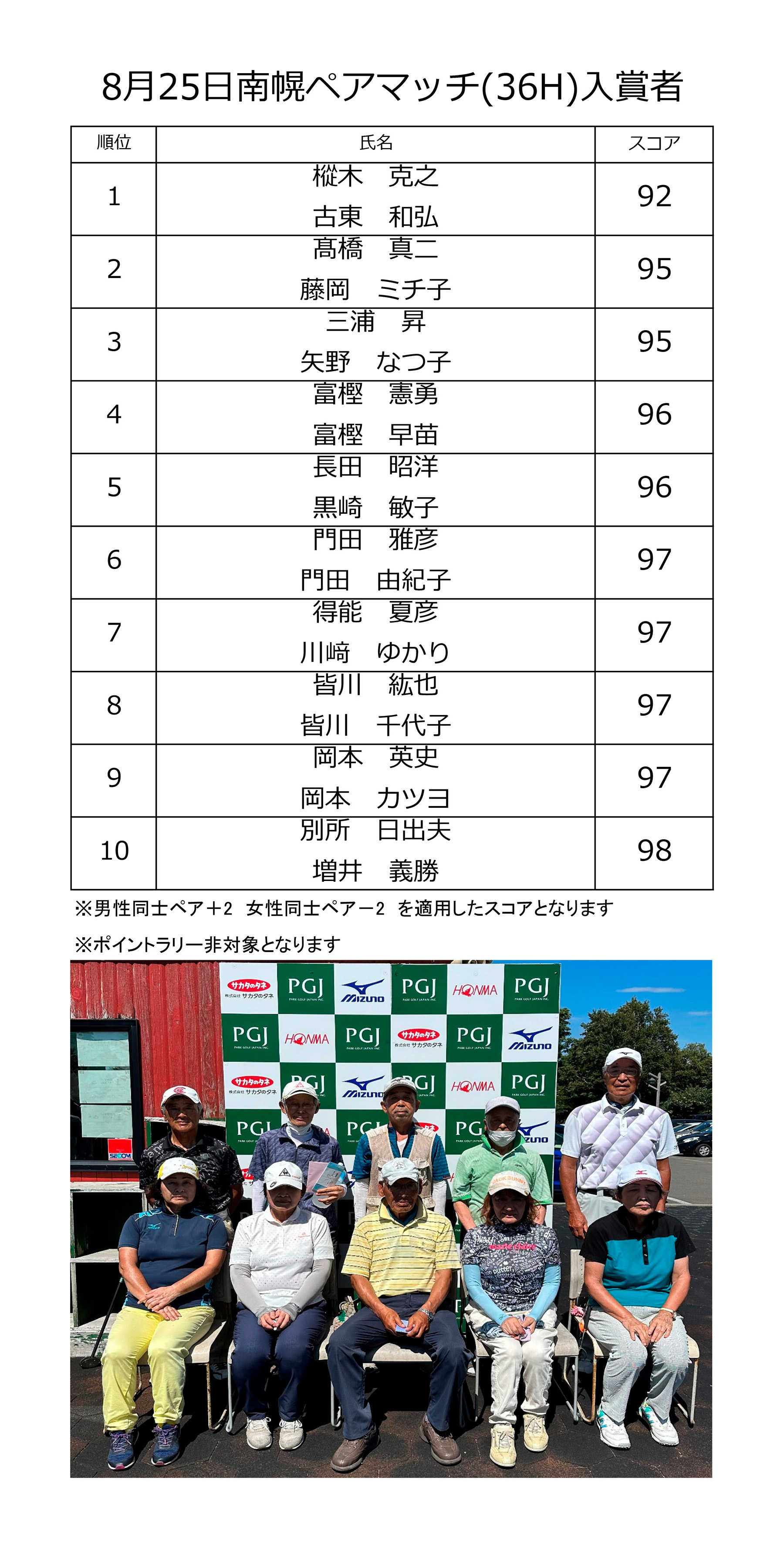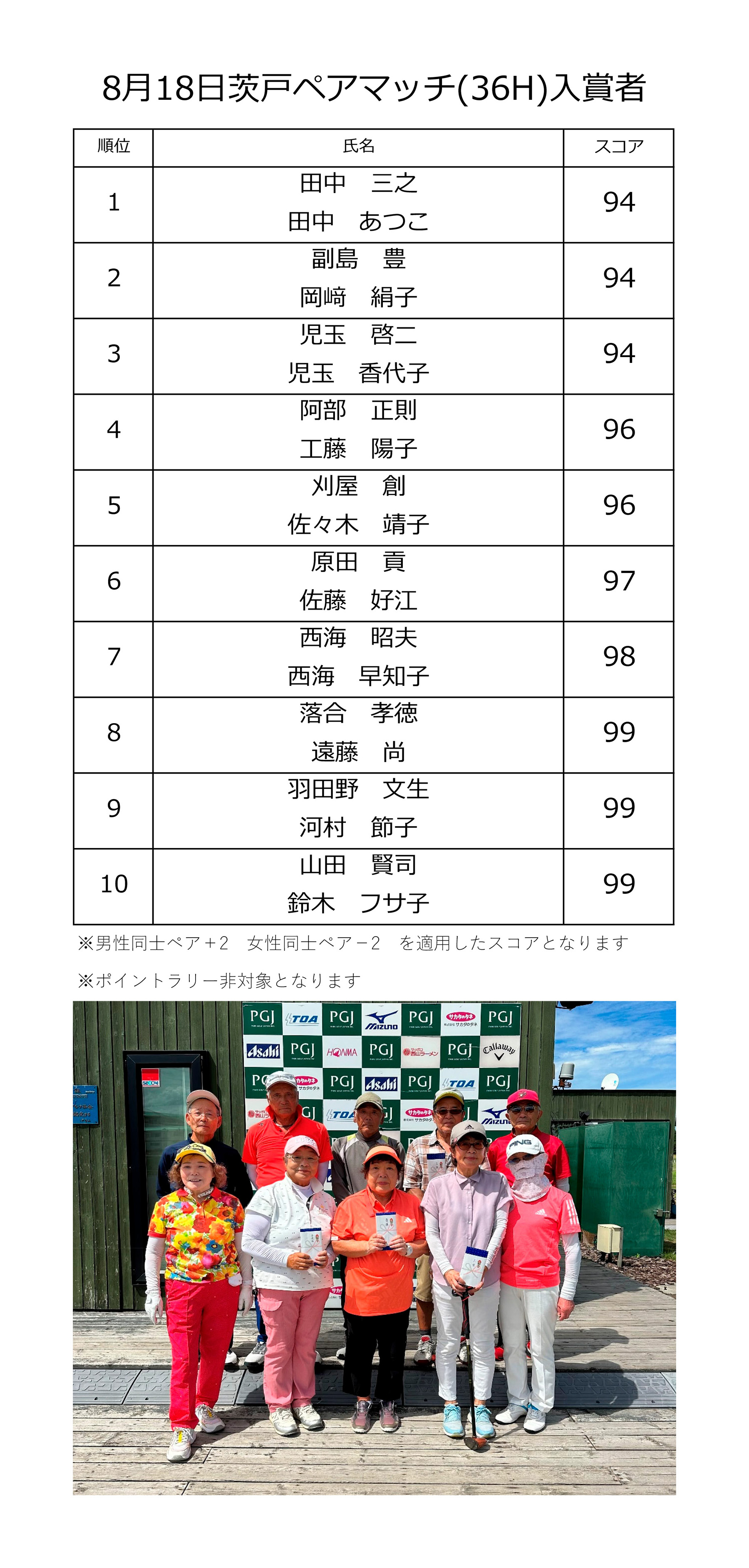 | 08月25日(金) | ペア大会 | ¥4,000 | オープン大会・食事なし | 結果 |