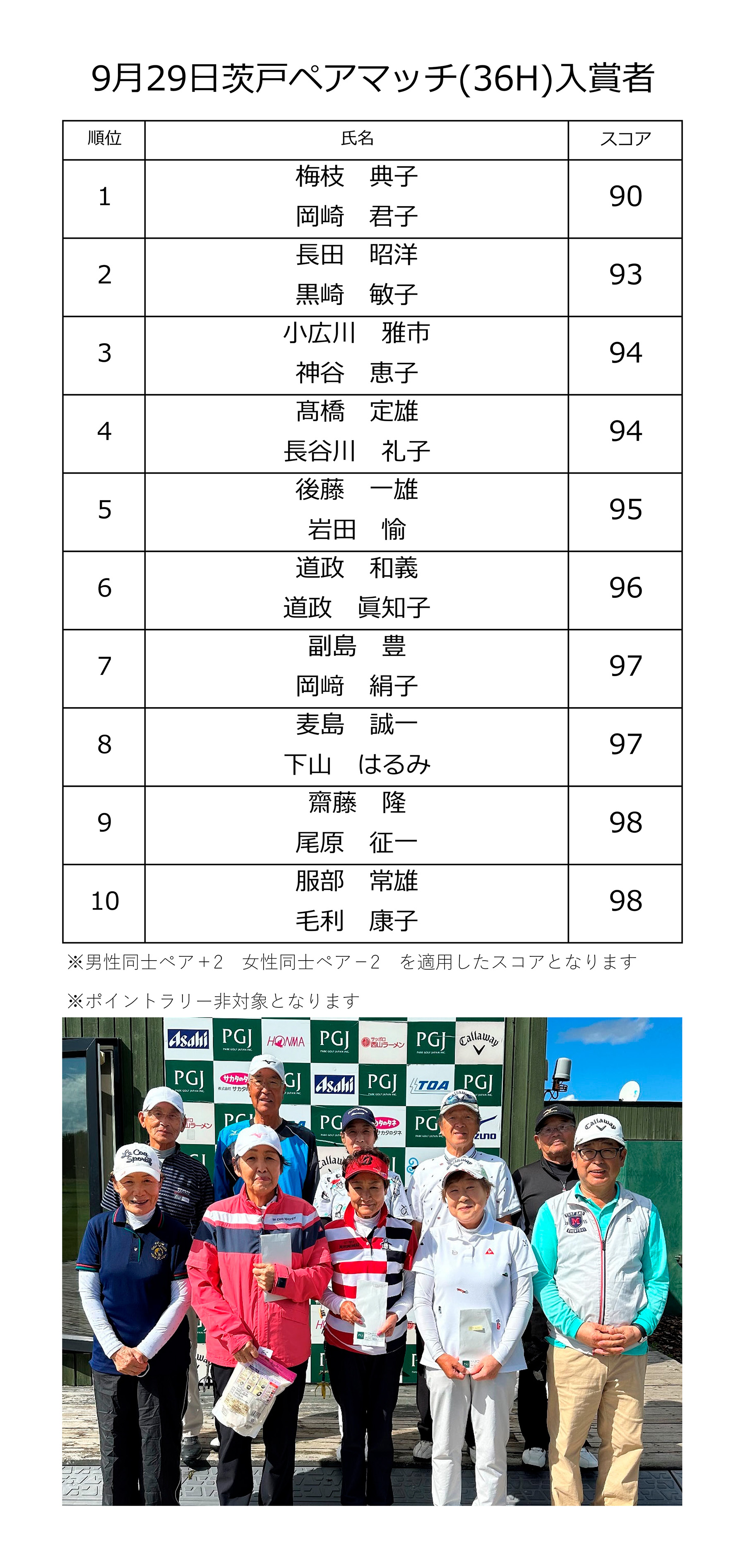 | 09月29日(金) | ペア大会 | ¥4,000 | オープン大会・食事なし | 結果 |