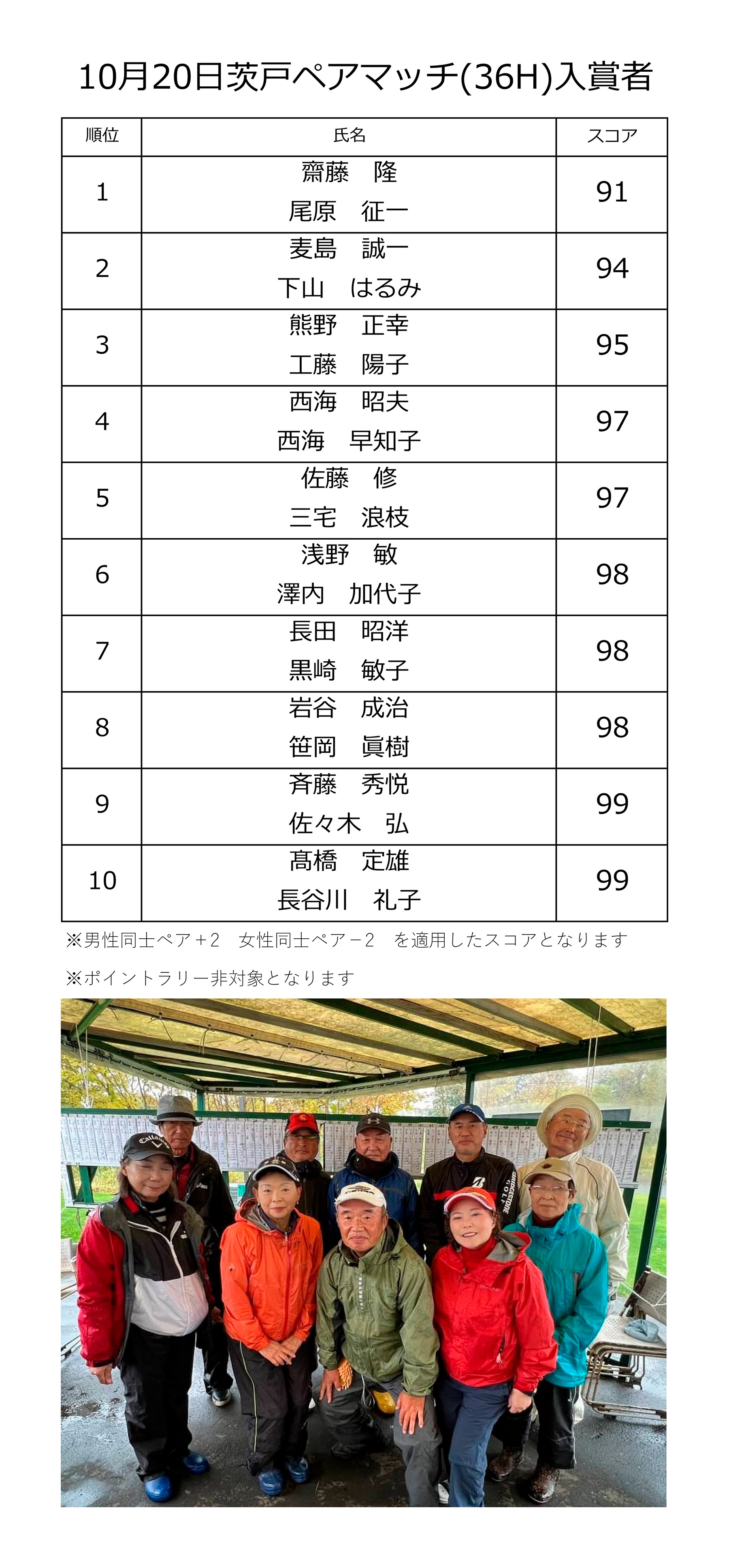 | 10月27日(金) | ペア大会 | ¥4,000 | オープン大会・食事なし | 結果 |
