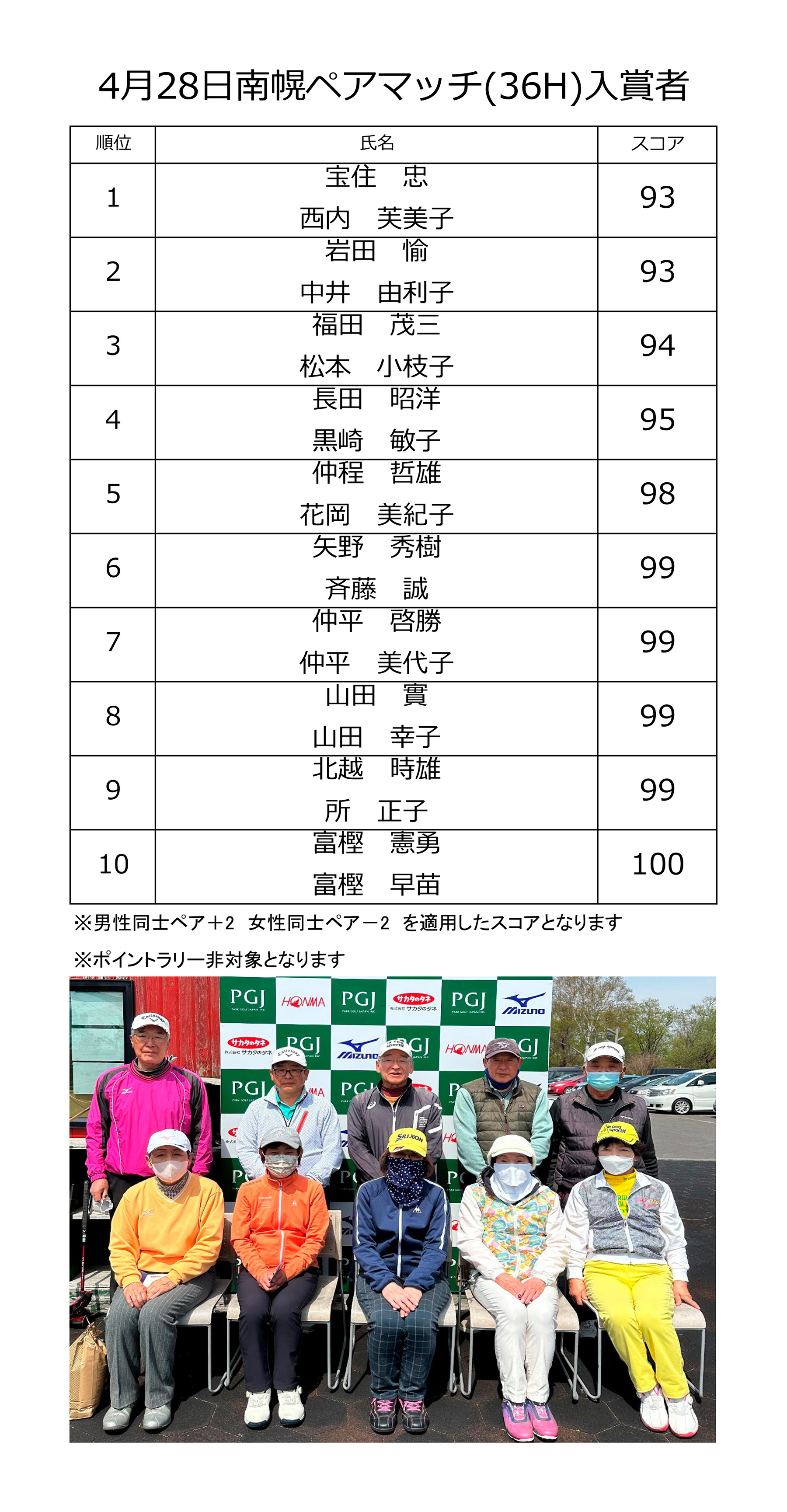 | 04月28日(金) | ペア大会 | ¥4,000 | オープン大会・食事なし | 結果 |
